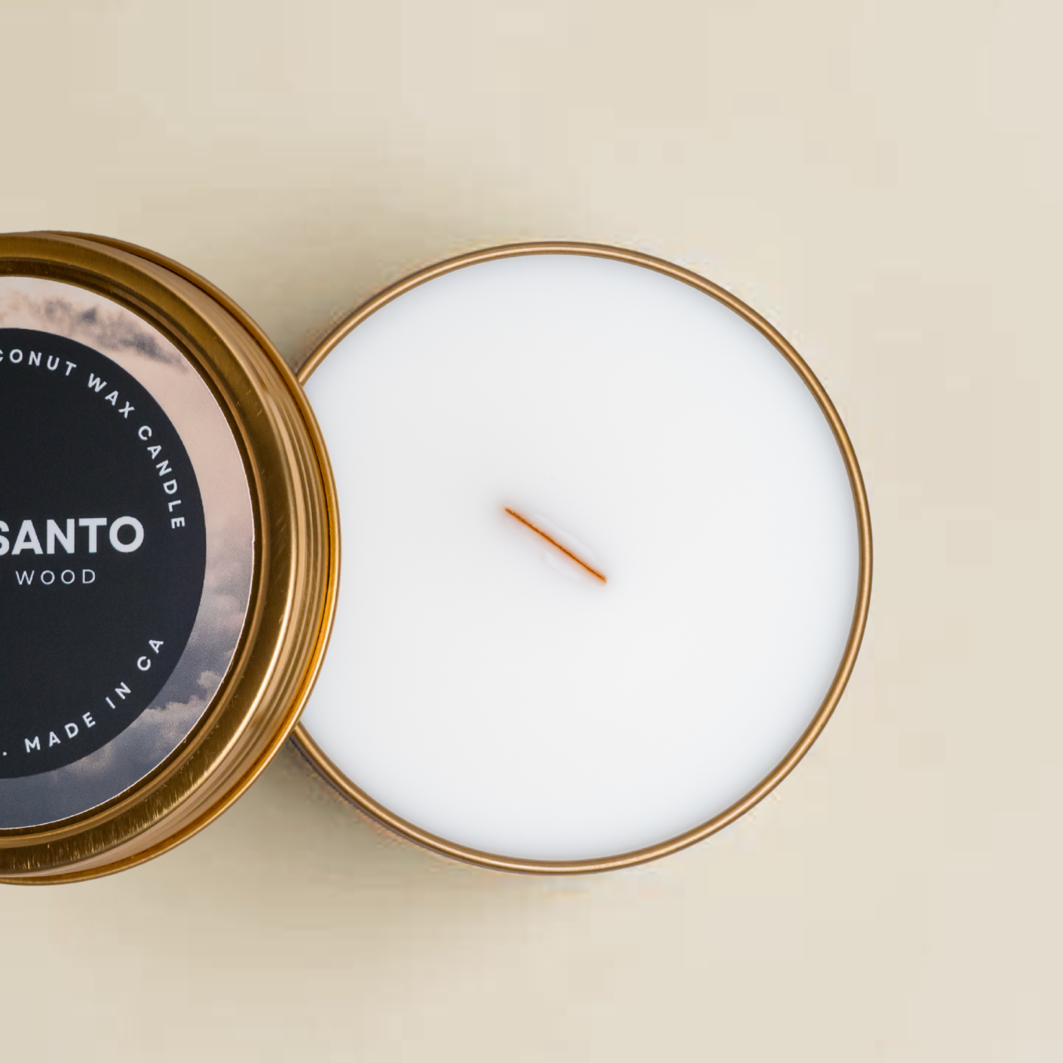 PRODUCTO: Una vela de cera de coco vegana de 3,5 oz vertida a mano en una lata plana de acero dorado con tapa de rosca | Más de 20 horas de combustión